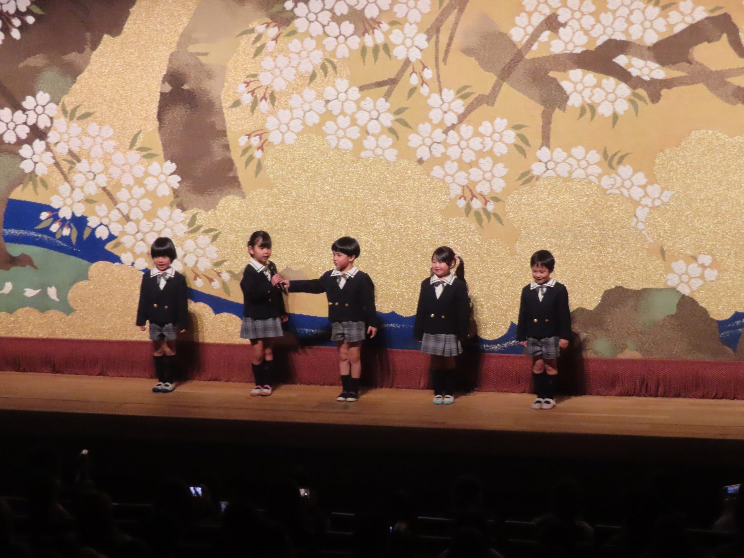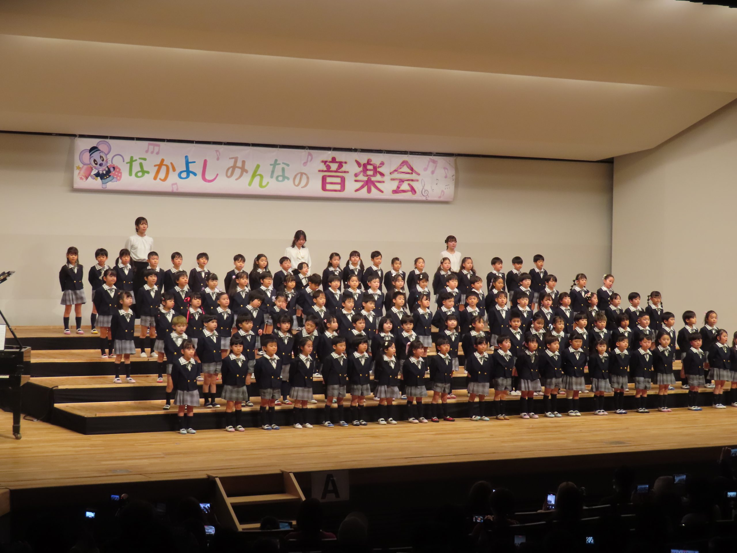新しく完成した、志免町町民センターサクラみらいホールで行われた『なかよしみんなの音楽会』当日はとても寒く、朝から気温も低い一日でしたが、子ども達は新しい施設に少し戸惑いながらも一歩入ると、表情がキリッと引き締まり、自分の出番をじっと待つ姿が見られました。